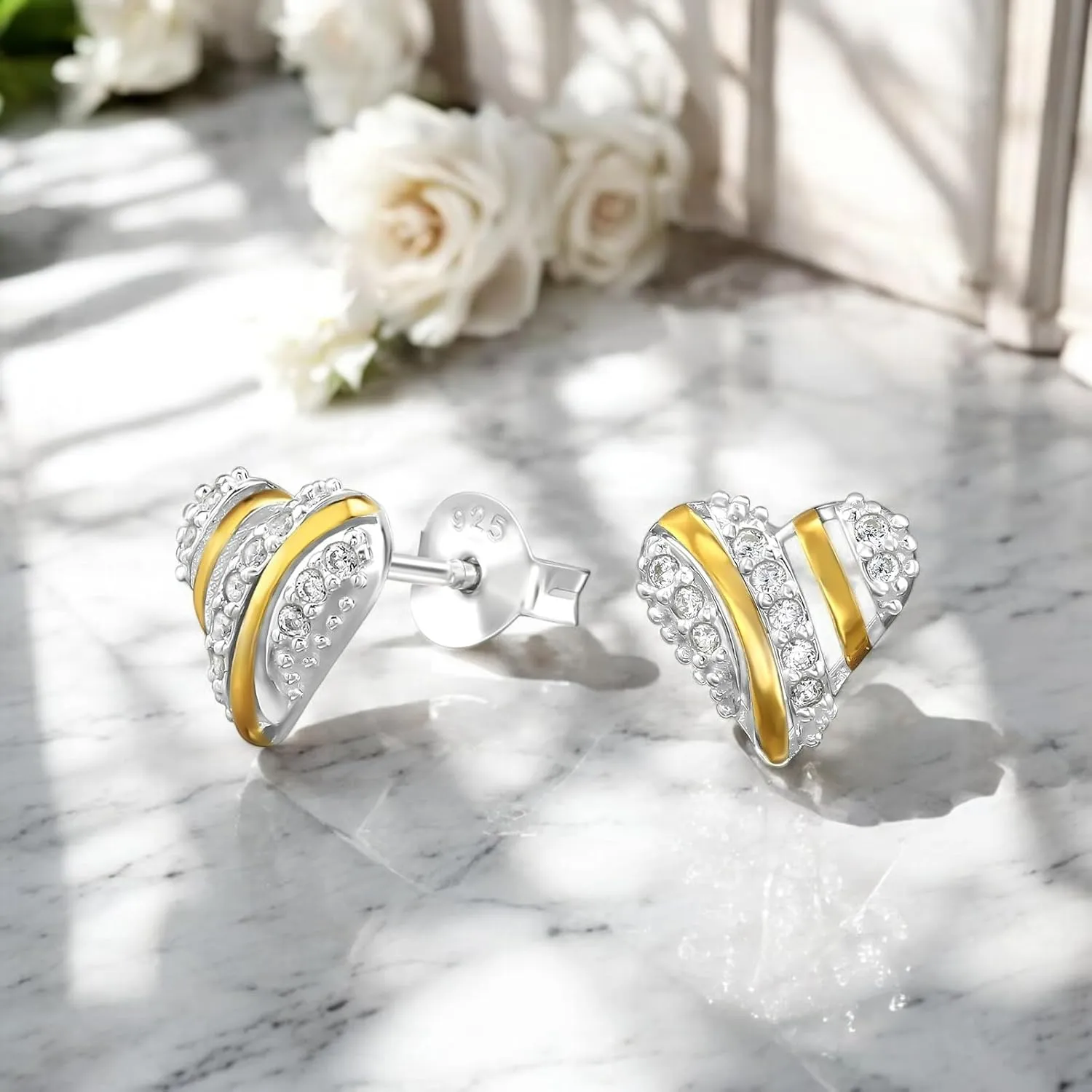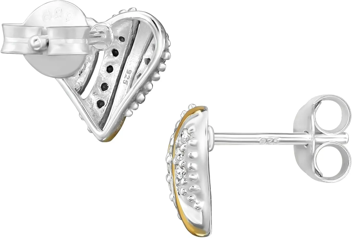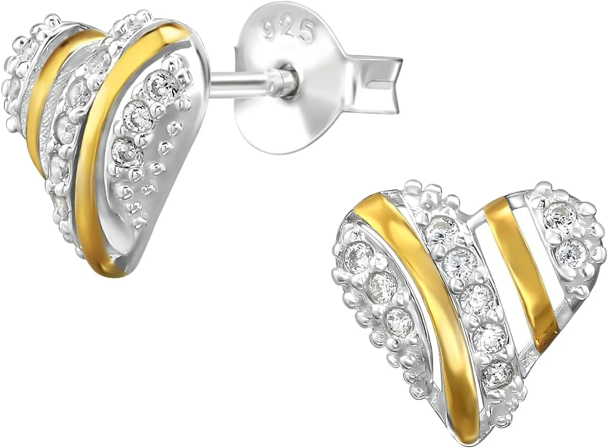 Pendientes de Plata 925 Bicolor, Corazón con Circonitas, Chapado en Oro y Plata, 8mm x 8mm, 20 Piedras, 0.85g